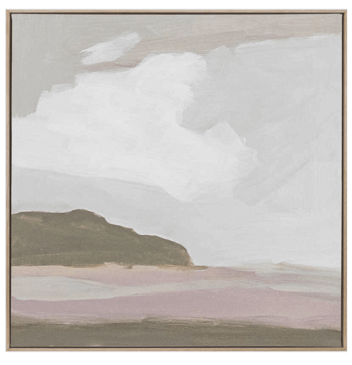 Headland Canvas Art Print – Under an imposing white cloud where sky meets sea the headland intercepts, creating a rocky shore for waves to crash – and play out nature’s great drama. Sit back and take in soft pink, gentle grey and brown, a naturally soothing palette, and wide, generous paint strokes. Complimentary muted tones of stone, white and dusty pink create a dramatic yet harmonious piece to showcase in your living space.