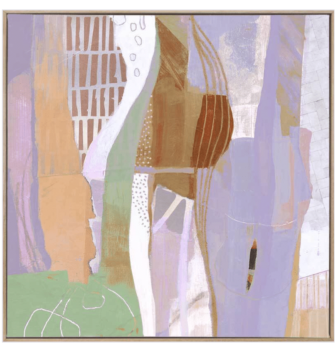 A collage of random lines, shapes, and patterns come together in perfect harmony, celebrating the beauty in all things unconventional. With a vibrant colour palette featuring lilac undertones and pops of khaki green and warm brown, this piece has a textural feel to it, perfect for bringing a dynamic flair to any space.