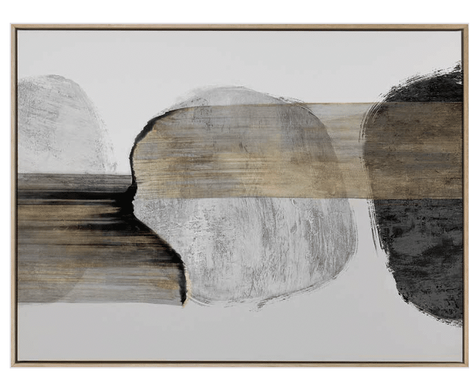 For classic abstract lovers, this simple piece uses asymmetry for a statement look, with wide, transparent brush strokes swiped across the three circular forms in the centre. A sophisticated palette of black, grey and white with glimmers of gold makes this a highly versatile piece.