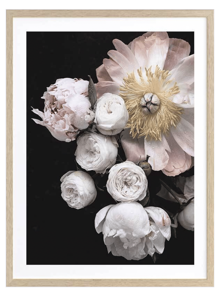 his photographic poster print Peonies and Roses Poster is the representation of a marriage made in heaven. This romantic image portrays a floral arrangement containing white double-petalled flowers nesting with a brilliant single-petalled version.