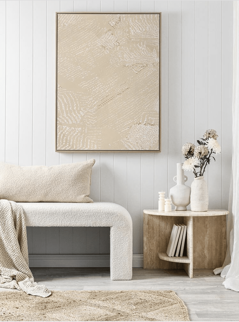 Sandstorm Clay Canvas Art Print – Like caught in a sandstorm, this piece features small dot work formed into abstract patterns blowing across the canvas in a soft, dreamy dance. A simple neutral palette featuring beige and soft white, with hints of warm brown, makes this a highly versatile piece for any interior style.