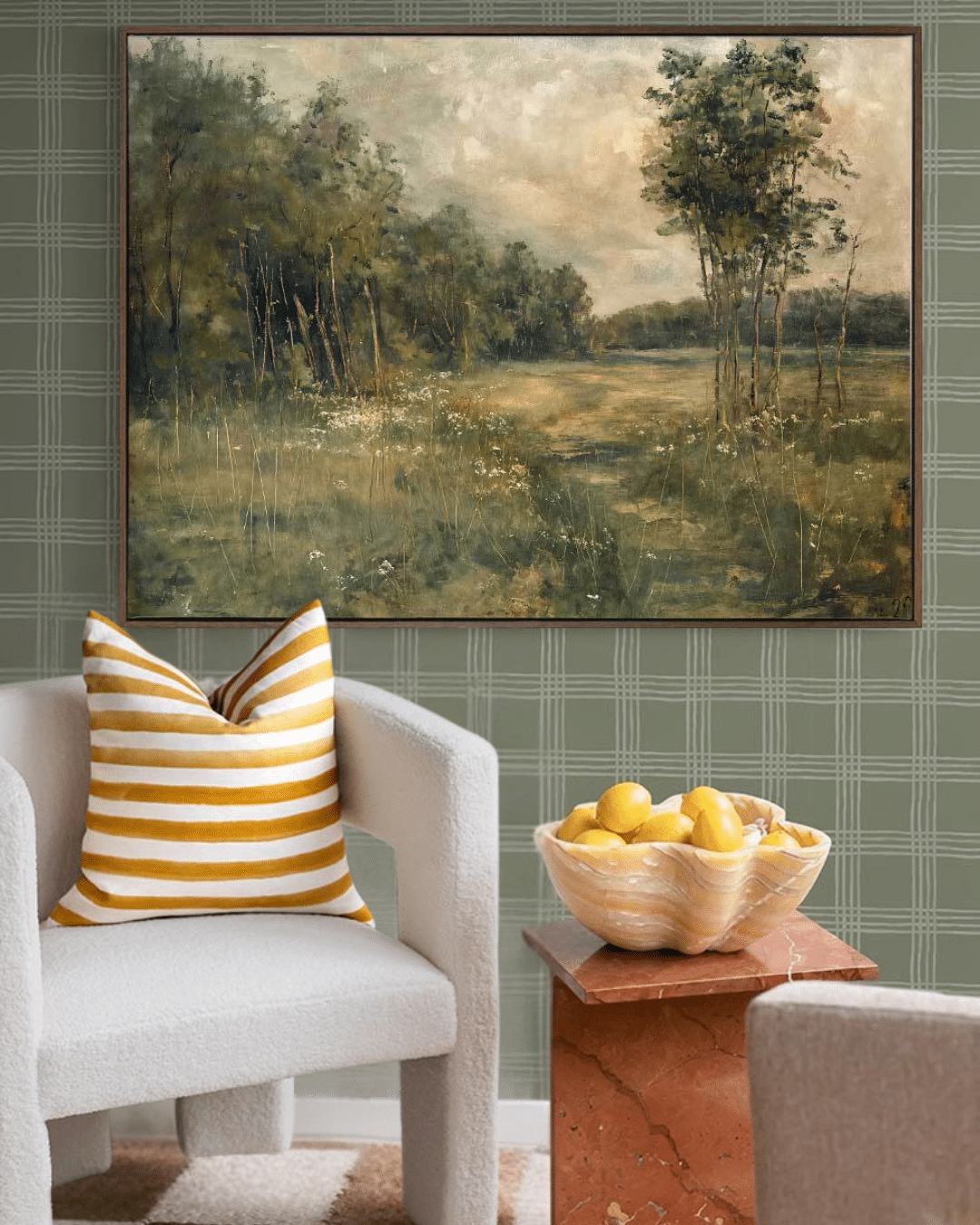 Wildflower Daydreams Canvas Art Print – This artwork by Darren Palmer captures a serene landscape, where gentle greens and warm earth tones blend to create a tranquil scene. The delicate brushstrokes and layered textures evoke a sense of calm and connection to nature, making it a perfect addition to any interior design style. This art print, rich in detail and atmosphere, will enhance your home decor with its peaceful beauty, bringing a touch of the idyllic countryside into any living room or bedroom.