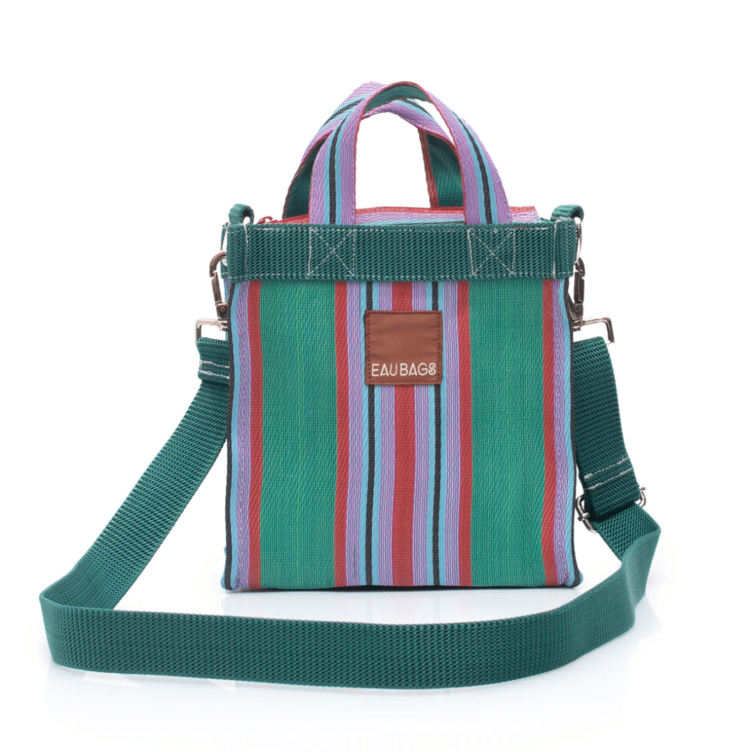 Each EAU BAG is handcrafted by skilled artisans in our dedicated studio in India. Olivia and Claudine visit their studio regularly to spend time with the team and oversee the making of each collection. Our signature stripes are made from 100% recycled nylon – an upcycled material created from waste like discarded fishing nets, old carpets and factory off-cuts. These materials are collected, cleaned and melted down before being spun and hand-dyed into new nylon yarn. The yarn is then woven into our durable striped fabric before being cut, stitched and assembled by hand into your most used bag. Because these materials have lived a life before becoming an EAU BAG, you may notice subtle variations in colour, texture or stitching. These are not defects, but part of the bag’s story – proof it was made by real hands, from materials that once existed elsewhere.