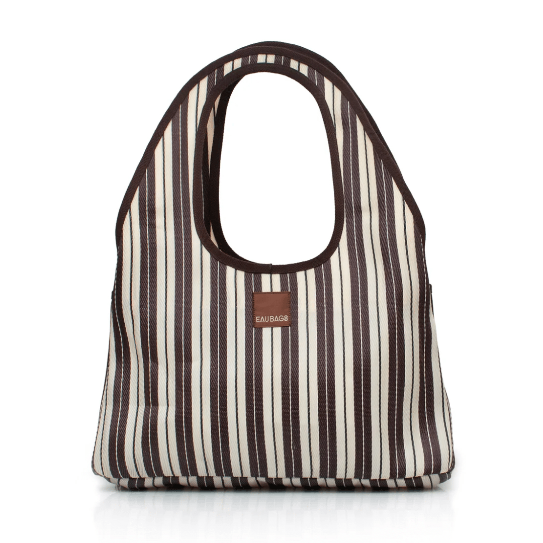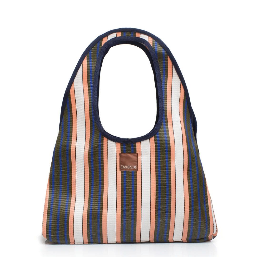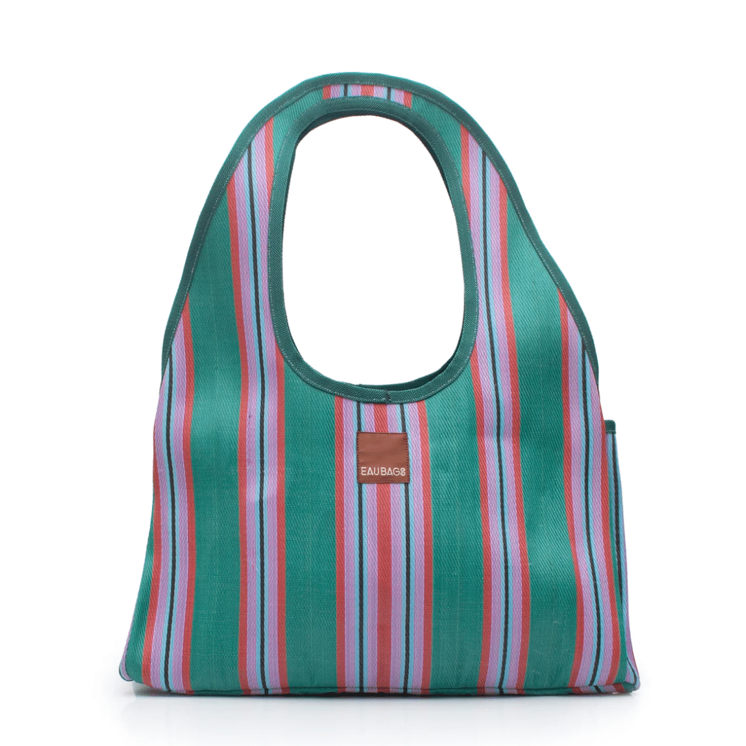 Each EAU BAG is handcrafted by skilled artisans in our dedicated studio in India. Olivia and Claudine visit their studio regularly to spend time with the team and oversee the making of each collection. Our signature stripes are made from 100% recycled nylon – an upcycled material created from waste like discarded fishing nets, old carpets and factory off-cuts. These materials are collected, cleaned and melted down before being spun and hand-dyed into new nylon yarn. The yarn is then woven into our durable striped fabric before being cut, stitched and assembled by hand into your most used bag. Because these materials have lived a life before becoming an EAU BAG, you may notice subtle variations in colour, texture or stitching. These are not defects, but part of the bag’s story – proof it was made by real hands, from materials that once existed elsewhere.