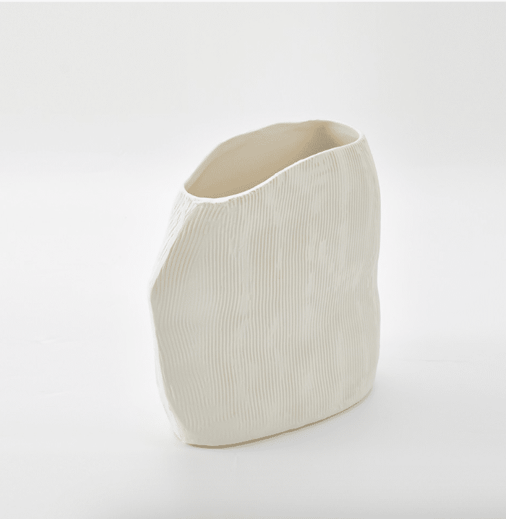 Hand made and hand finished ceramic vase.Linear organic fins surrounding these handmade ceramic vases add a distinct sculptural element. Finished in matte black with hand etched surfaces.ā Low 150h x 300w x 70dā Tall 260h x 255w x 145d
