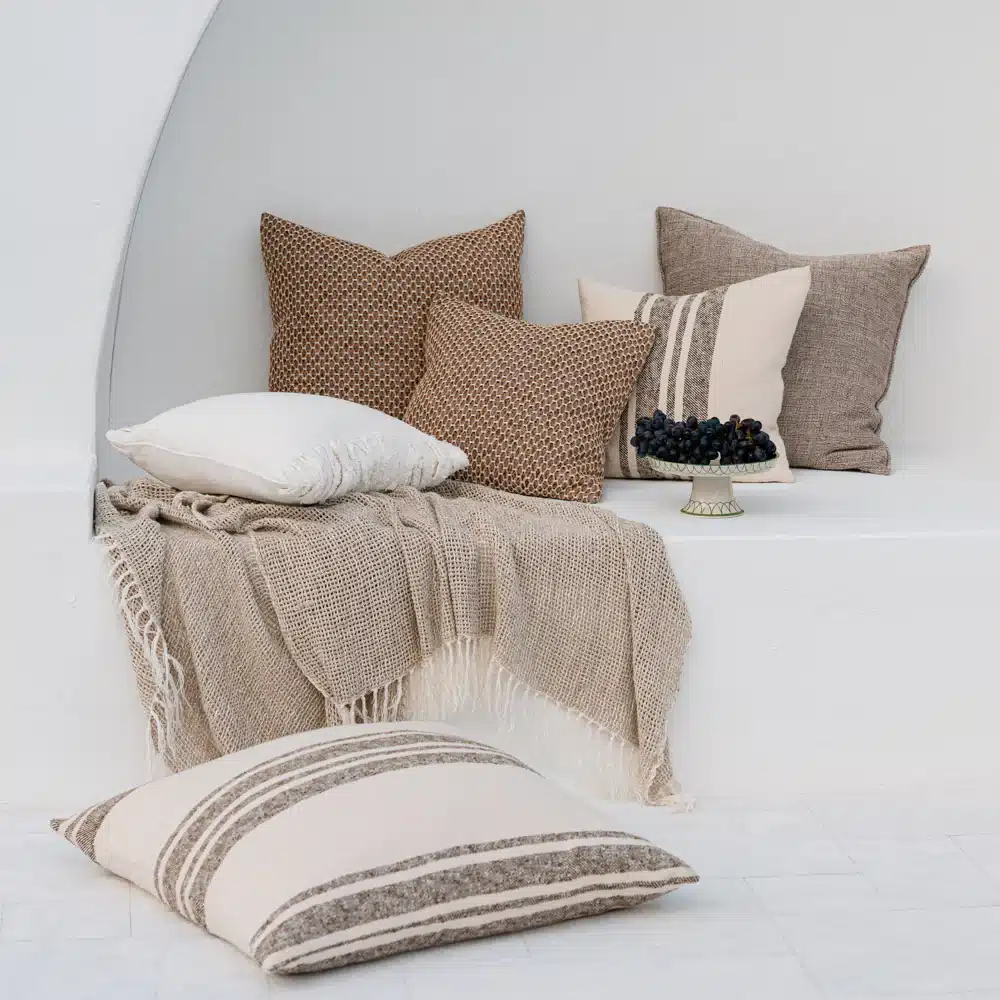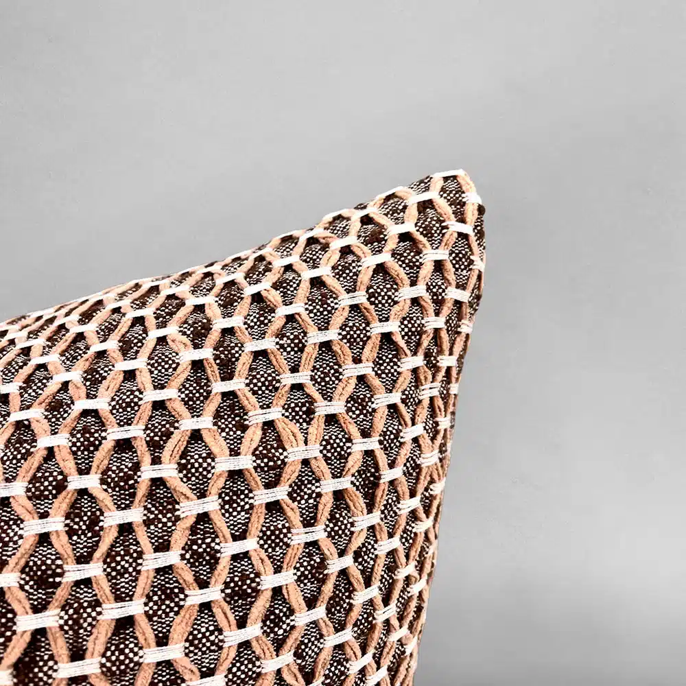 The Arenza Cushion brings together artisanal texture and earthy richness. Woven from a jacquard cotton-linen blend, it layers deep chocolate with a clay-toned overlay, creating a tactile surface that feels both expressive and full of depth.