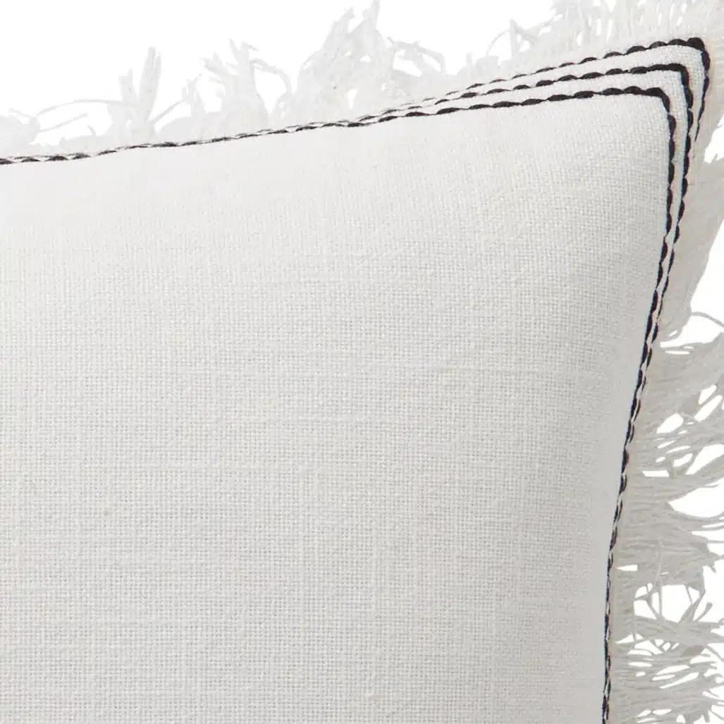 This cushion brings together the elegance of embroidery and the casual appeal of frayed edges, making it a standout piece for any room.