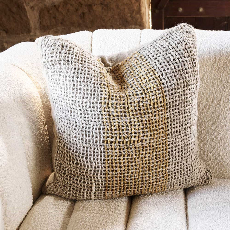 Introducing the Granita linen cushion, a stunning accent cushion showcasing a netted hand woven coloured panel through the centre that pairs beautifully with our hero colours of the season – rust and camel to create head turning charm.