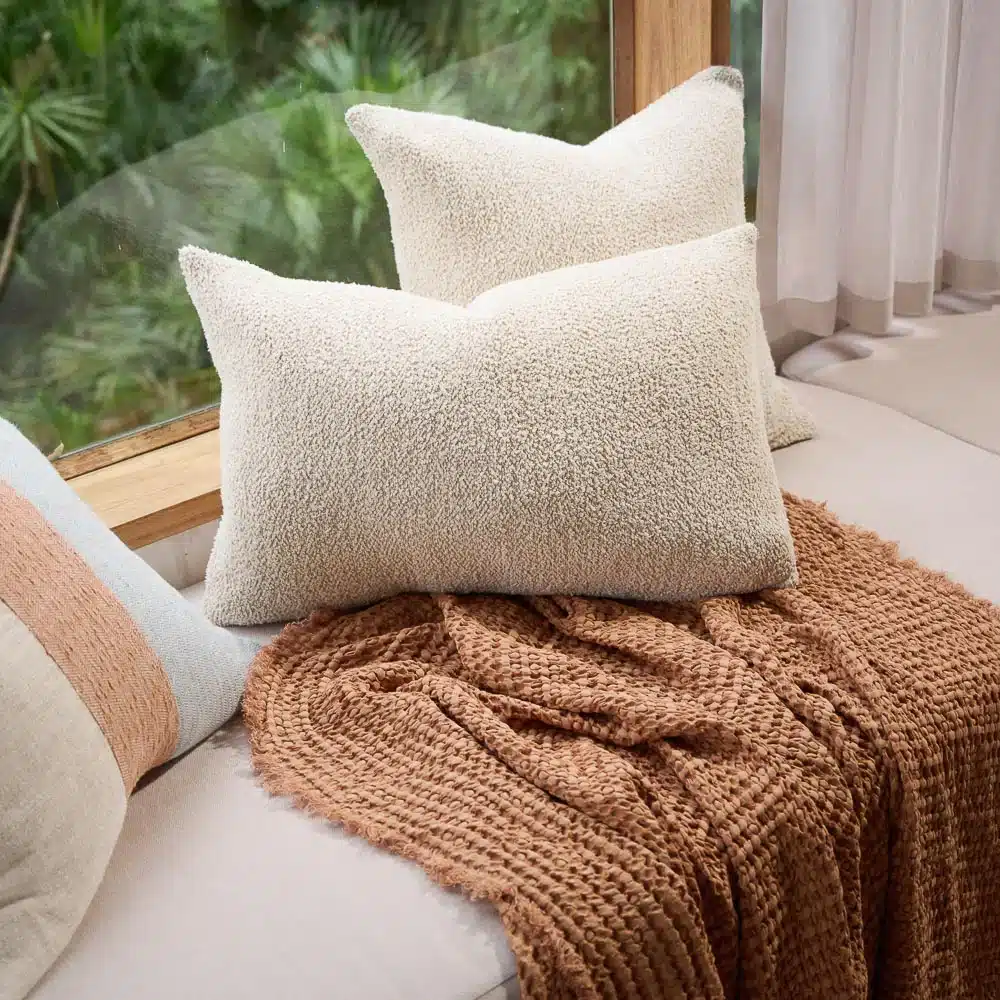 Textural essential. Densely looped cotton with refined, cloud-soft surface and composed, weighty hand. The boucle adds depth without noise, holds crisp silhouette while feeling inviting to touch. Inspired by Australian sandy shorelines. Made by our artisan partners in India. Effortless layer that grounds a setting and elevates everything around it.