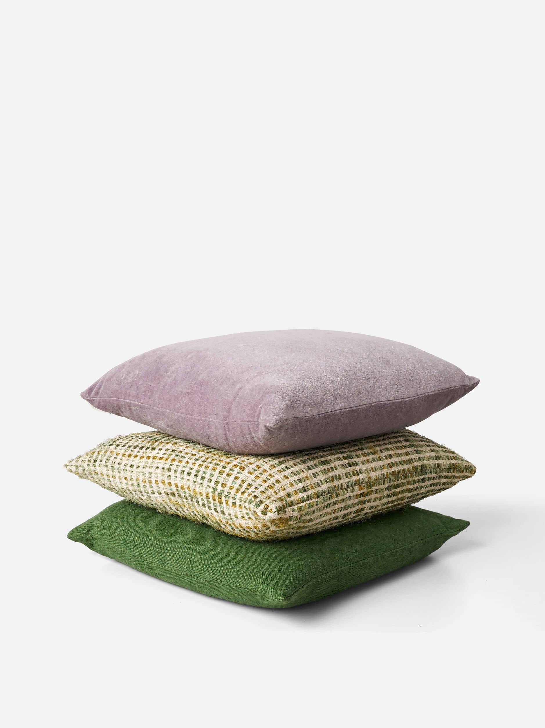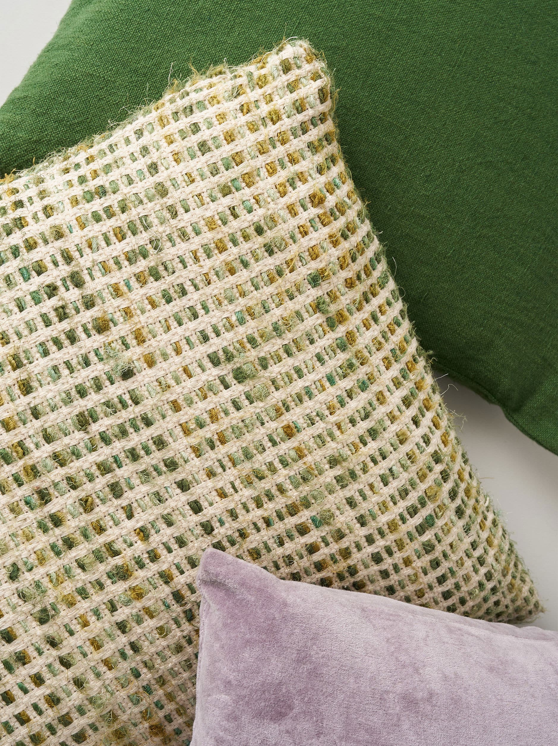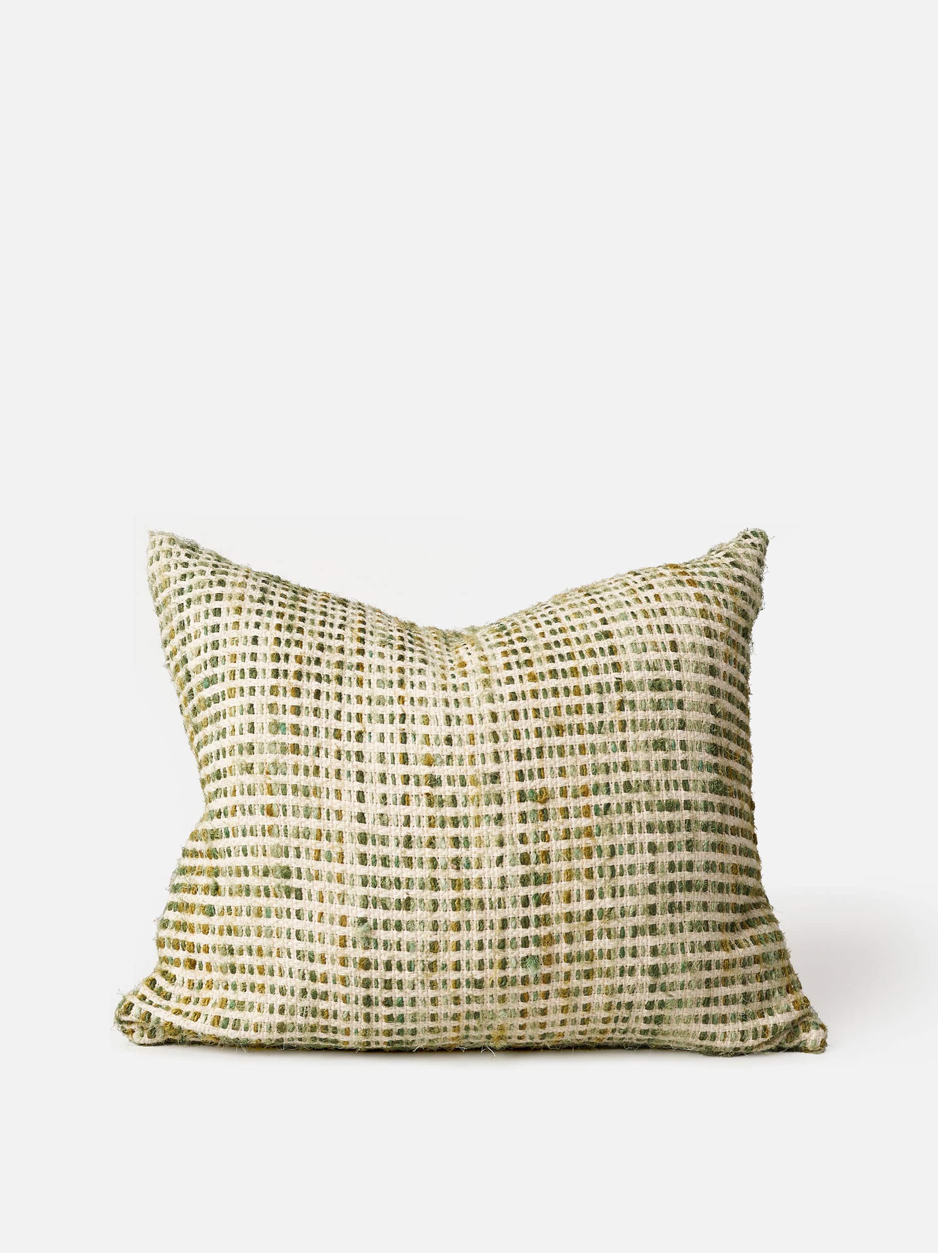 The heavyweight weave intersects neutral tones with the shifting hues of a deep green gradient.