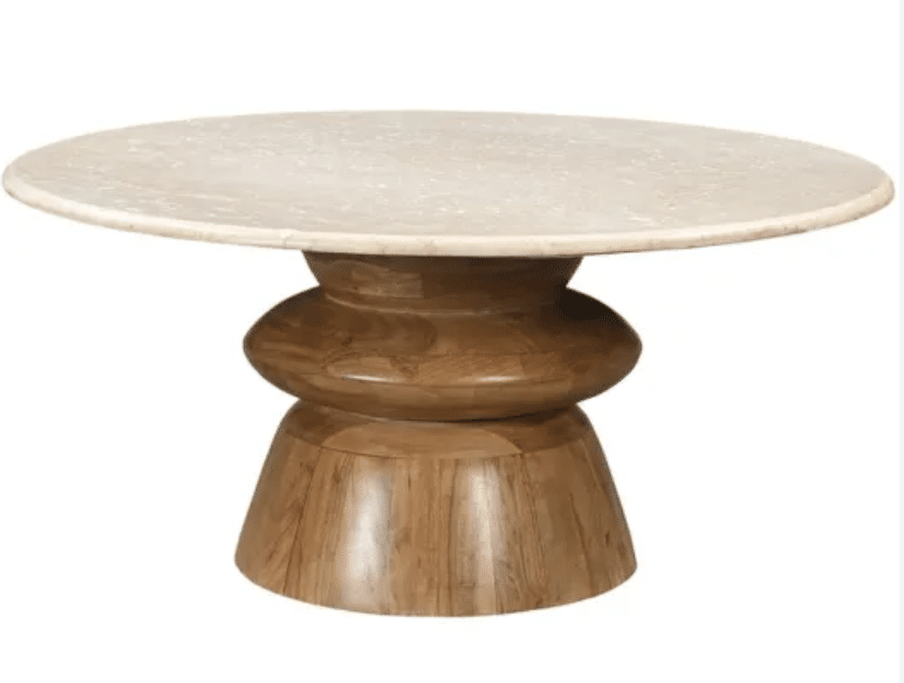 Supporting the marble top is a stunning sculptured turned Acacia wood base, expertly handcrafted to reveal the natural warmth, grain, and texture of solid wood. The artfully curved pedestal design offers visual balance and architectural charm, making this table a true statement piece in your living room.