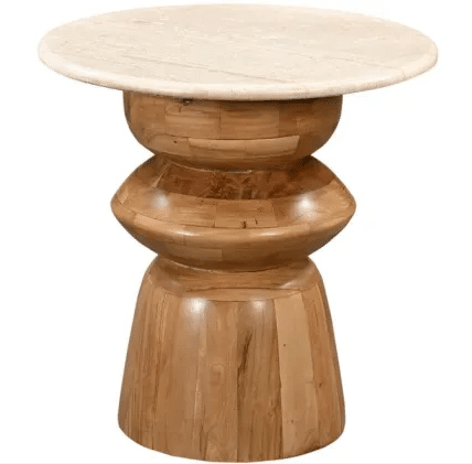Supporting the marble top is a stunning sculptured turned Acacia wood base, expertly handcrafted to reveal the natural warmth, grain, and texture of solid wood. The artfully curved pedestal design offers visual balance and architectural charm, making this side table a true statement piece in any room.
