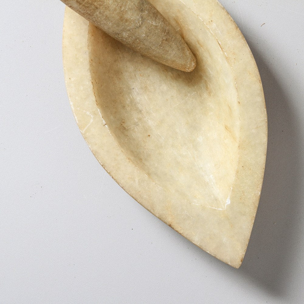Not your average mortar and pestle, this piece can sit proudly on display on your kitchen shelf or bench! Beautiful leaf petal shape makes them a standalone decor piece whilst also a functional kitchen accessory for grinding spices. Made in Rajasthan, India.