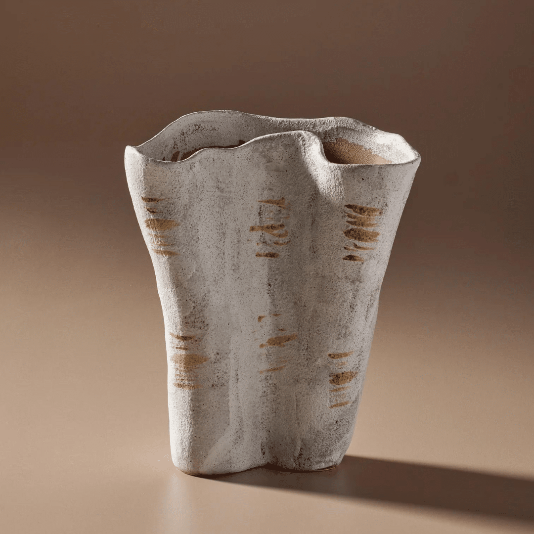Presenting the Lola Vase, a stylish and practical masterpiece drawing inspiration from the organic beauty of nature. This handmade ceramic vase, featuring an off-white hue and textured appearance, encapsulates the essence of fluid forms. Meticulously crafted, it showcases a wavy silhouette and subtle distressing, reflecting the artisan's dedication to distinctive craftsmanship.
