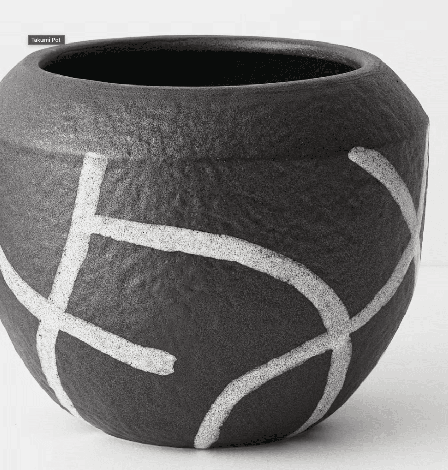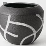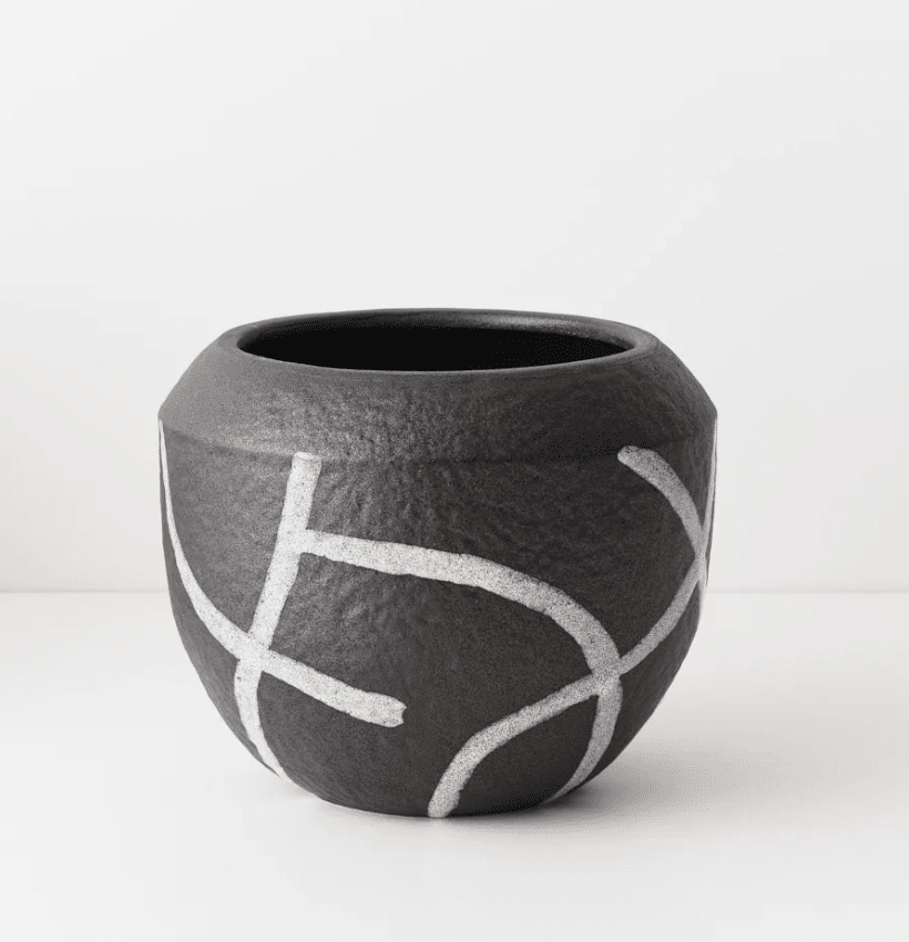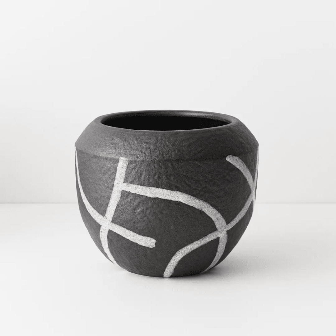 Low and rounded with a generous open top, this near-black pot features a striking geometric pattern that adds depth and character. The bold surface detail creates visual interest while the wide opening makes it easy to style small plants, stem arrangements or decorative elements.