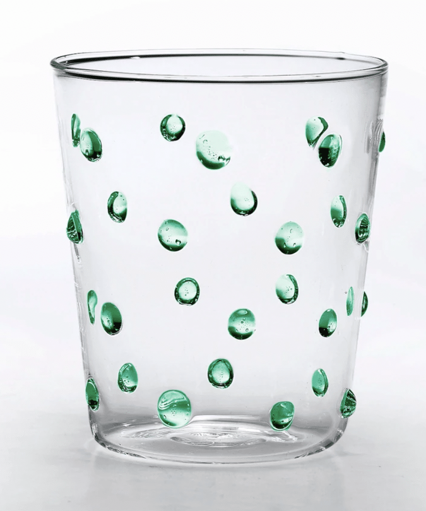 Hand made in borosilicate glass and thermal shock proof. Spots of glass are hand worked onto the outside of the tumbler creating a unique fun design. Each piece is unique. Dishwasher safe.