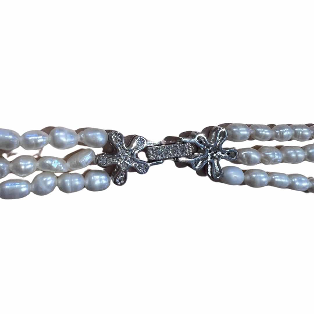 Introducing the stunning 3-Strand Birdseed Pearl Necklace, featuring an adorable flower-studded clasp. This exquisite piece combines elegance with a touch of whimsy, making it a perfect addition to any jewellery collection. The three strands of lustrous pearls are expertly arranged to create a layered look that is both sophisticated and charming. The flower-studded clasp adds a delightful finishing touch, enhancing the necklace's unique appeal. Ideal for special occasions or as a statement piece for everyday wear, this necklace is sure to turn heads and garner compliments wherever you go.