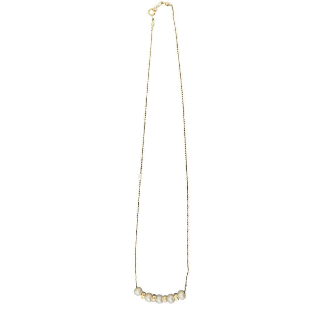 Introducing the 5 Sweet Freshwater Pearl Necklace, a stunning piece where the pearls truly shine. Divided by delicate 9ct gold beads, this necklace beautifully showcases the natural luster of each freshwater pearl. The gold accents provide a subtle yet elegant contrast, enhancing the overall charm and sophistication of the piece. Perfect for any occasion, this necklace adds a touch of timeless elegance to your look. Whether you're dressing up for a special event or adding a bit of luxury to your everyday attire, this necklace is sure to be a standout addition to your jewellery collection.