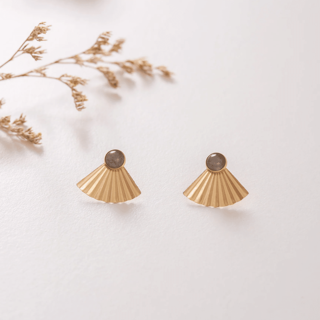 The CAMBODIA jacket Earrings from the YIN REFLECTION collection feature versatile fan-shaped designs that can be worn both front and back. Crafted with natural Labradorite gemstones, these earrings offer a 3-in-1 style to elegantly express your mood and style.