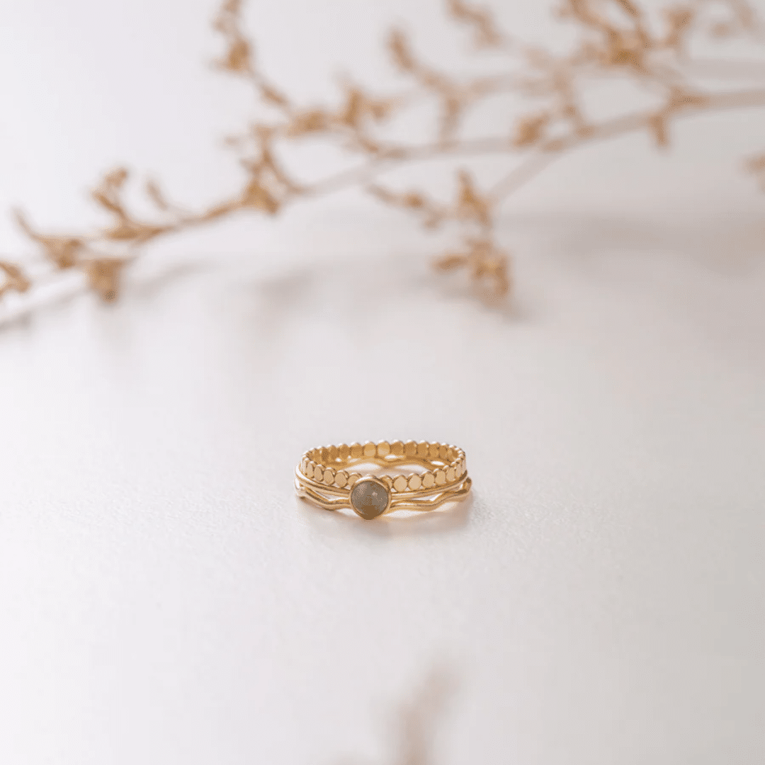 The CAMBODIA ring set from the YIN REFLECTION collection features a set of four intricately crafted rings in 14k gold-filled and natural Labradorite gemstone. This versatile set captures the essence of Cambodia's spiritual depth and cultural heritage, combining delicate craftsmanship with mystical allure, perfect for expressing your unique style with elegance and sophistication.