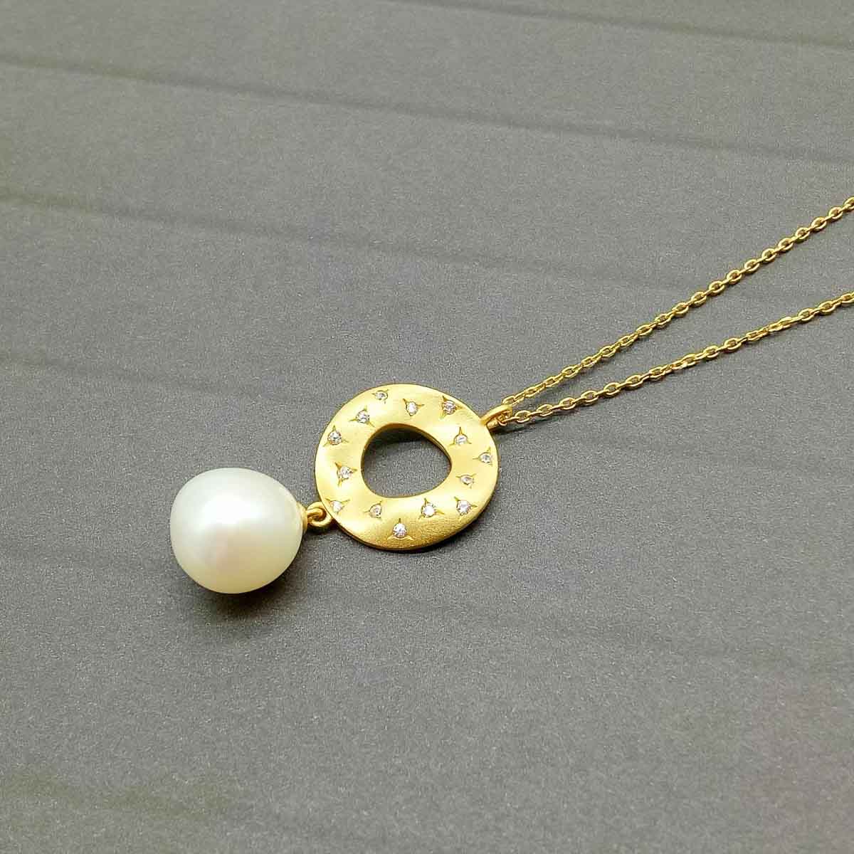 Surrounding the pearl are sparkling zircon accents that catch the light with every movement, adding a touch of brilliance to the understated design. This blend of fine materials—freshwater pearls, zircons, and 18k gold-plated sterling silver—brings a timeless warmth and sophistication, making this piece versatile enough for both special occasions and everyday elegance.