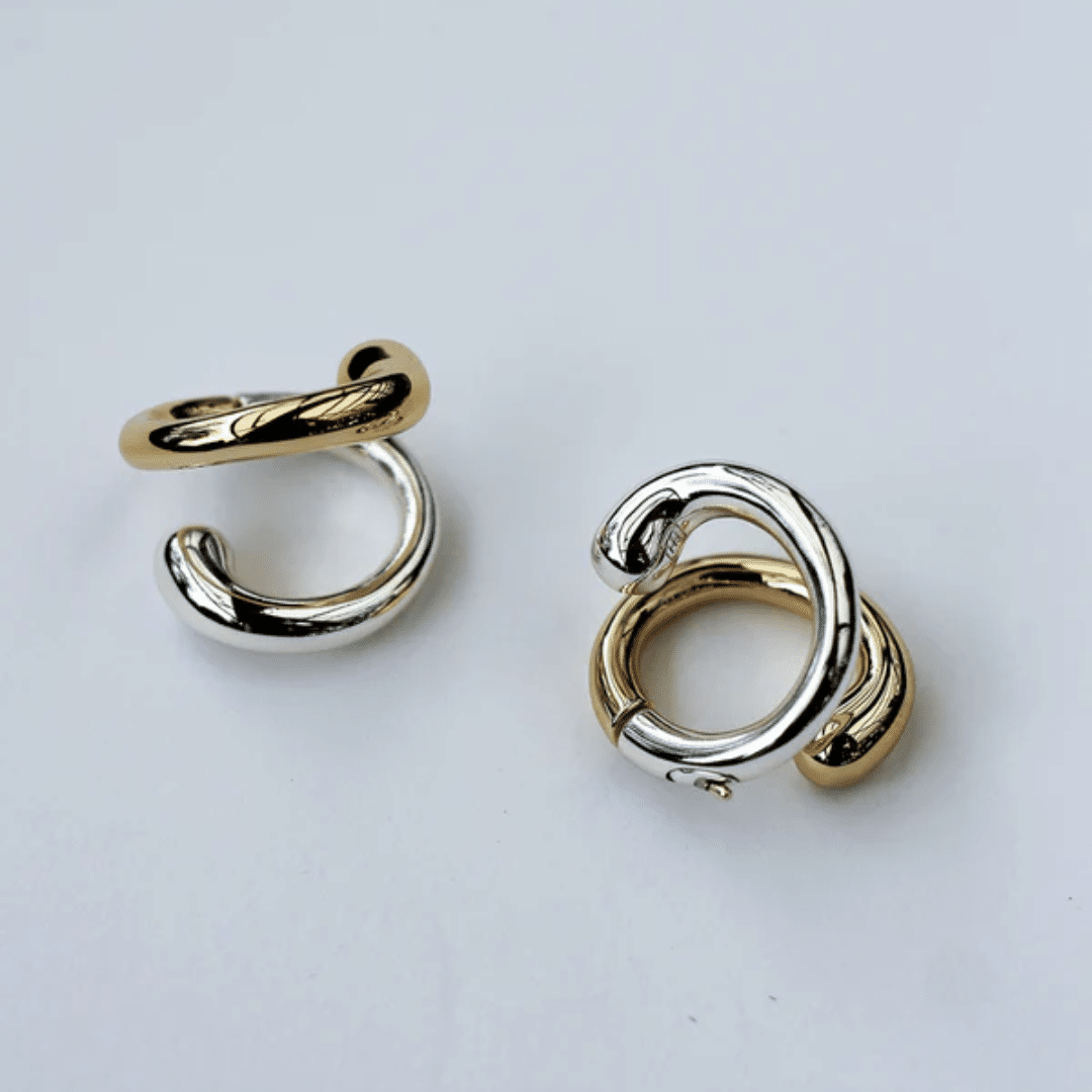 Our Double Trouble Hoop Earrings are two-toned hoop earrings plated in both 18K gold and sterling silver with a modern sculptural design.