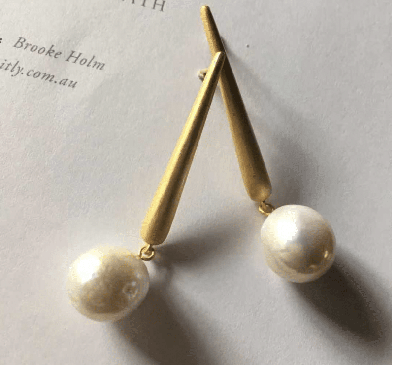 A free form freshwater pearl dangle from an organic shape metal bar. 18K gold plated 925 silver.