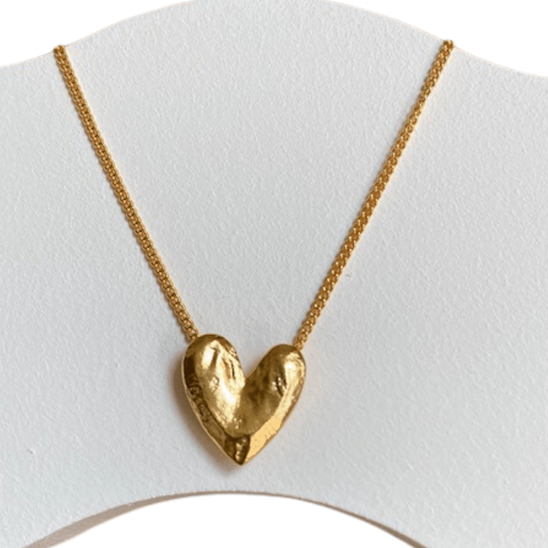 The Love Heart Pendant on a gold chain with embossed detailing is a charming and romantic piece of jewellery. This elegant necklace features a beautifully crafted heart-shaped pendant, intricately embossed with delicate patterns that add a touch of vintage sophistication. The detailed embossing enhances the pendant's visual appeal, making it a standout accessory that exudes timeless romance and charm.