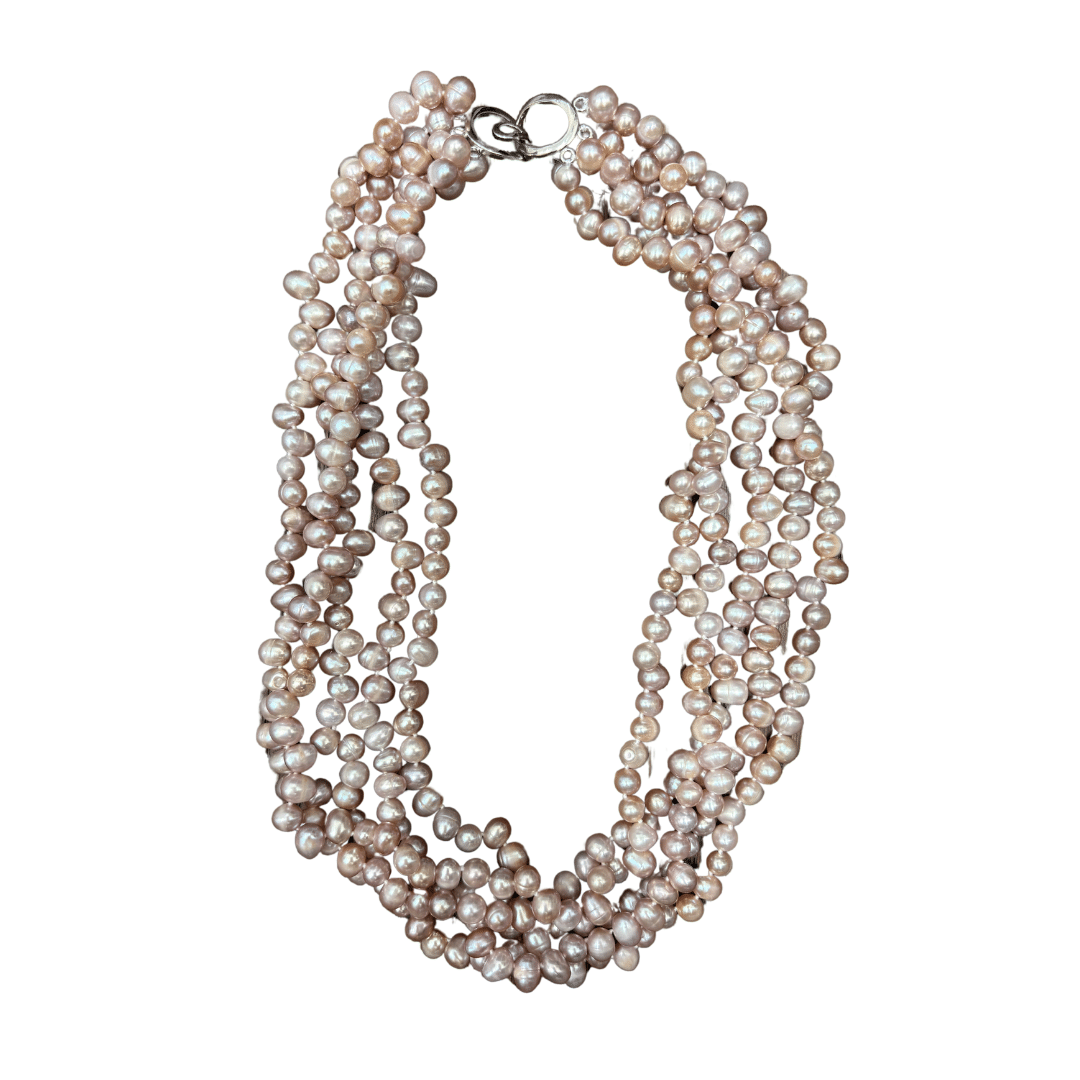 TheĀ Musk Pink Pearl NecklaceĀ is a stunning, handmade creation crafted with care in the coastal town of Byron Bay. Featuring five luxurious strands of freshwater pearls, this statement necklace blends classic elegance with modern sophistication. The soft, musk pink pearls add a unique touch of colour, making this piece stand out from traditional pearl jewellery.