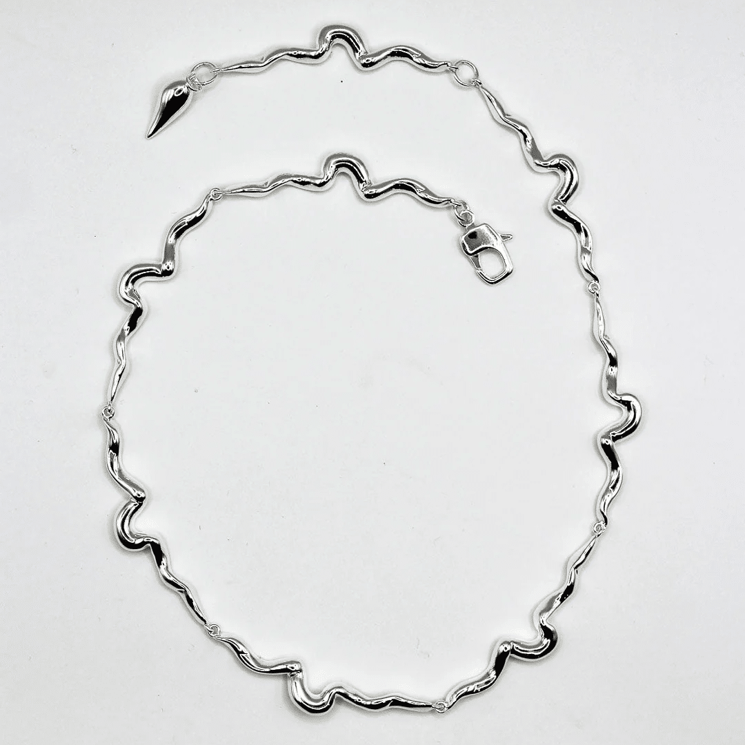 The Offbeat Neck Collar celebrates handcrafted form with it's wonky links joined to create an artistic statement necklace. The droplet tag detail also looks great when styled to the front for versatility.