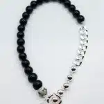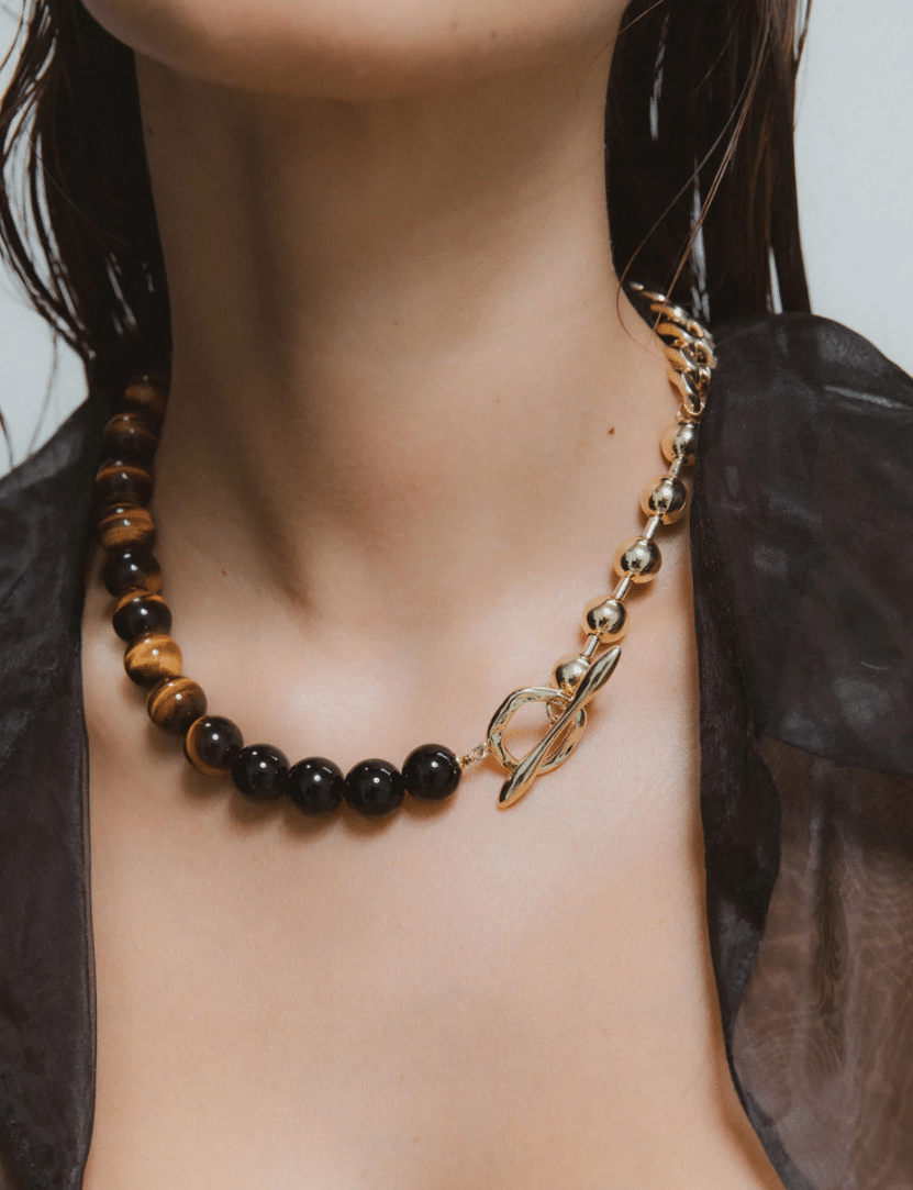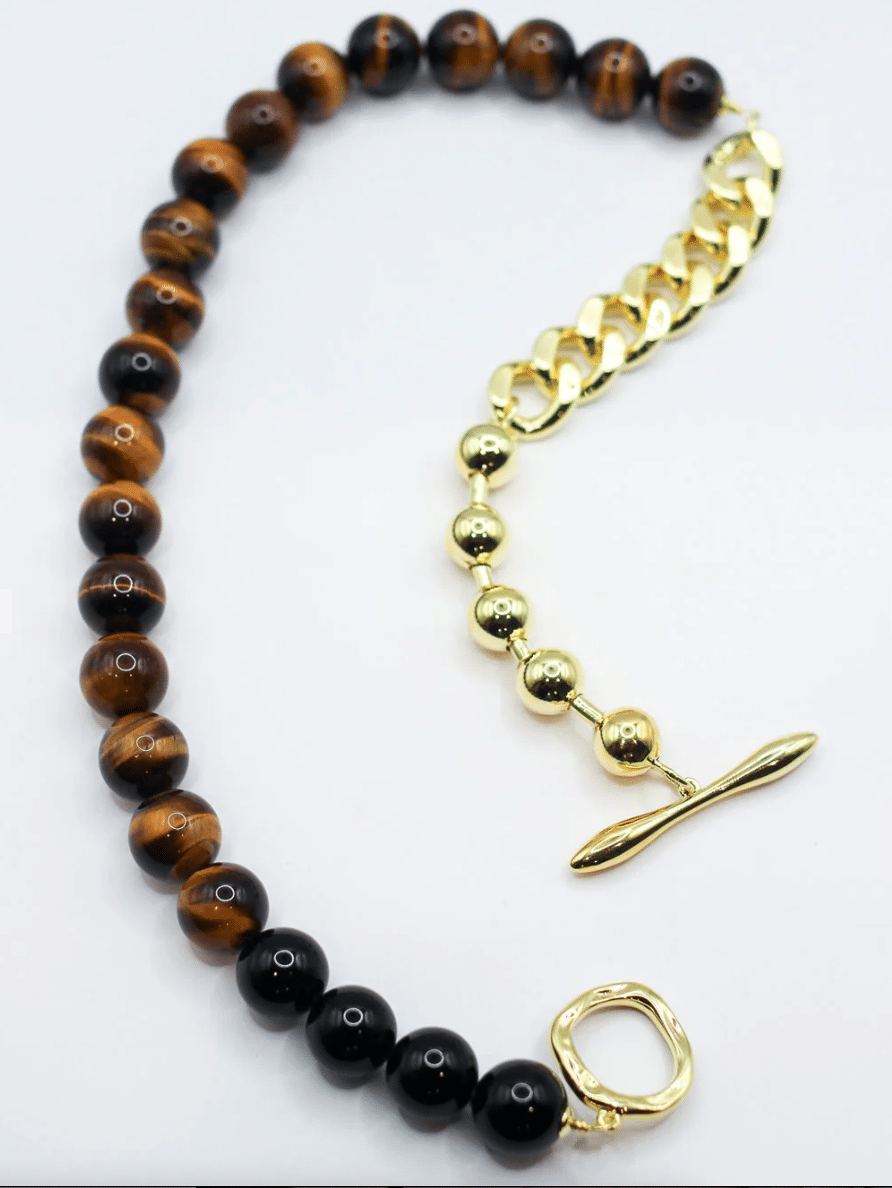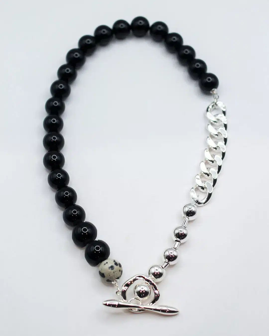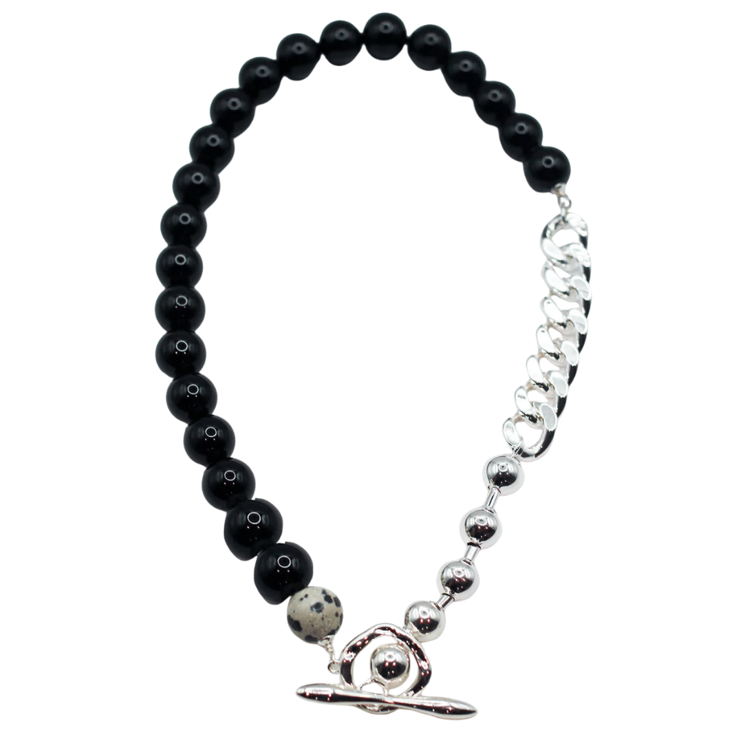 Experience the perfect blend of style and craftsmanship with the Primal Statement Necklace. Its intricate design incorporates contrasting statement chains, carefully crafted details, and stunning dalmatian jasper and onyx gemstones.