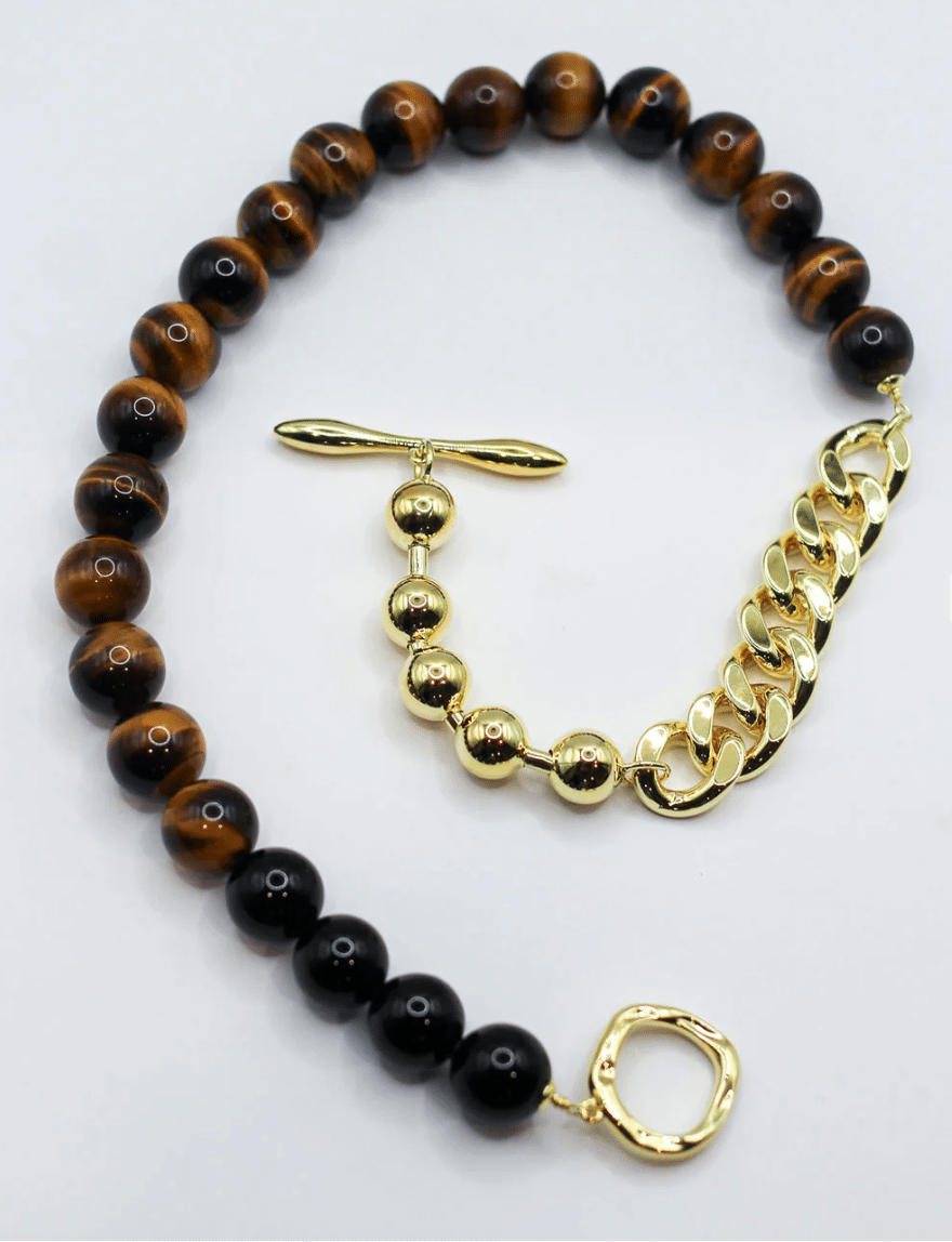 The Primal Statement Necklace is the ultimate accessory for any fashion-forward individual due to its styling versatility. Wear this chunky necklace with the statement chains and fob detail to the front for a tough-luxe look or keep the beaded gemstones as the main focus for on-trend styling.