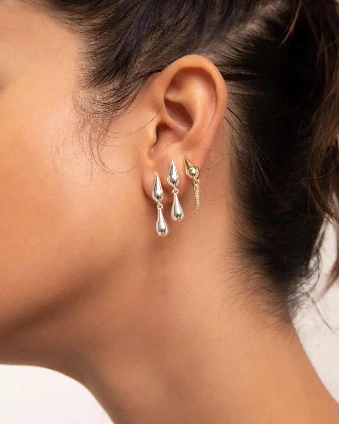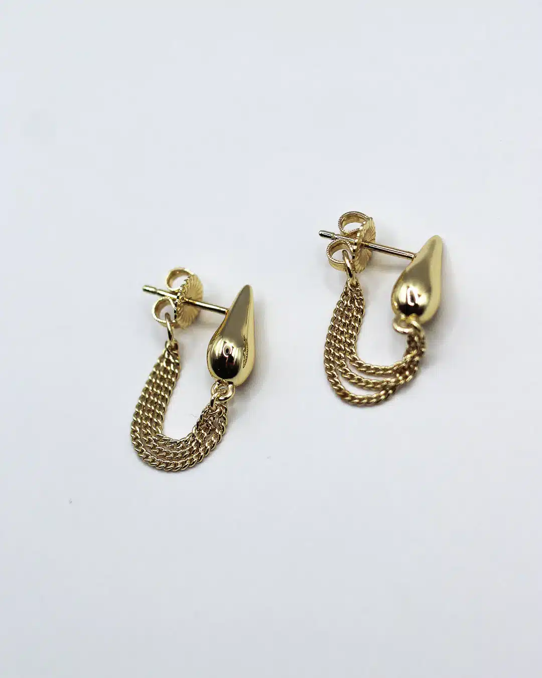The Rainfall Chain Studs utilise our favourite teardrop shape adorned with three fine curb chains to wrap the ear lobe. This earring is perfect to wear on its own our to layer with your other favourite F+H earrings.