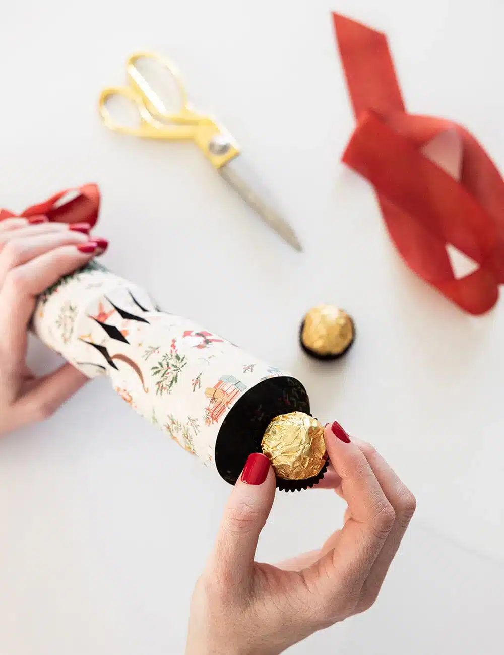 7. Fill the cracker with your treats and seal the other end with ribbon ready for Christmas!