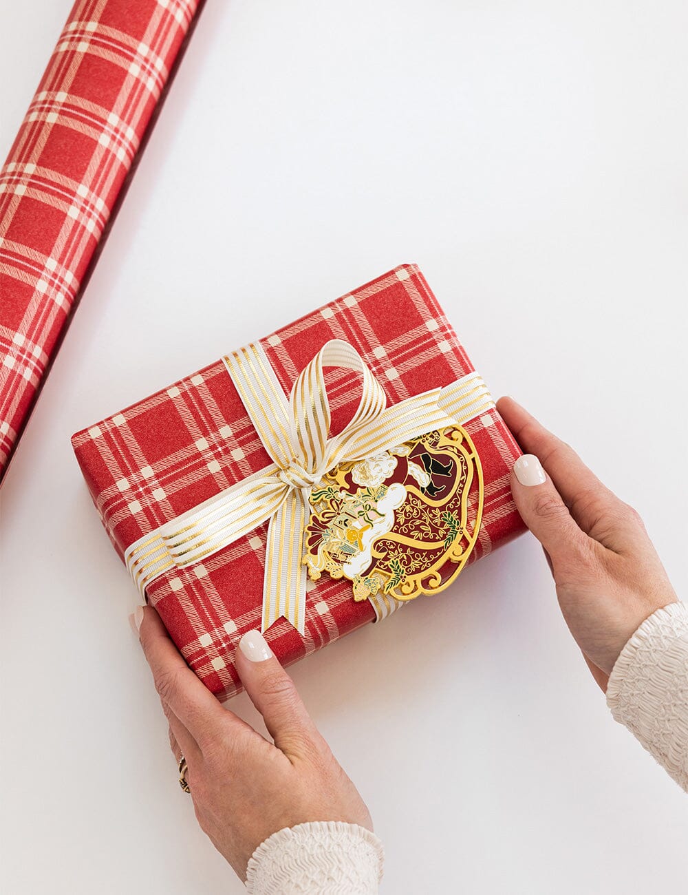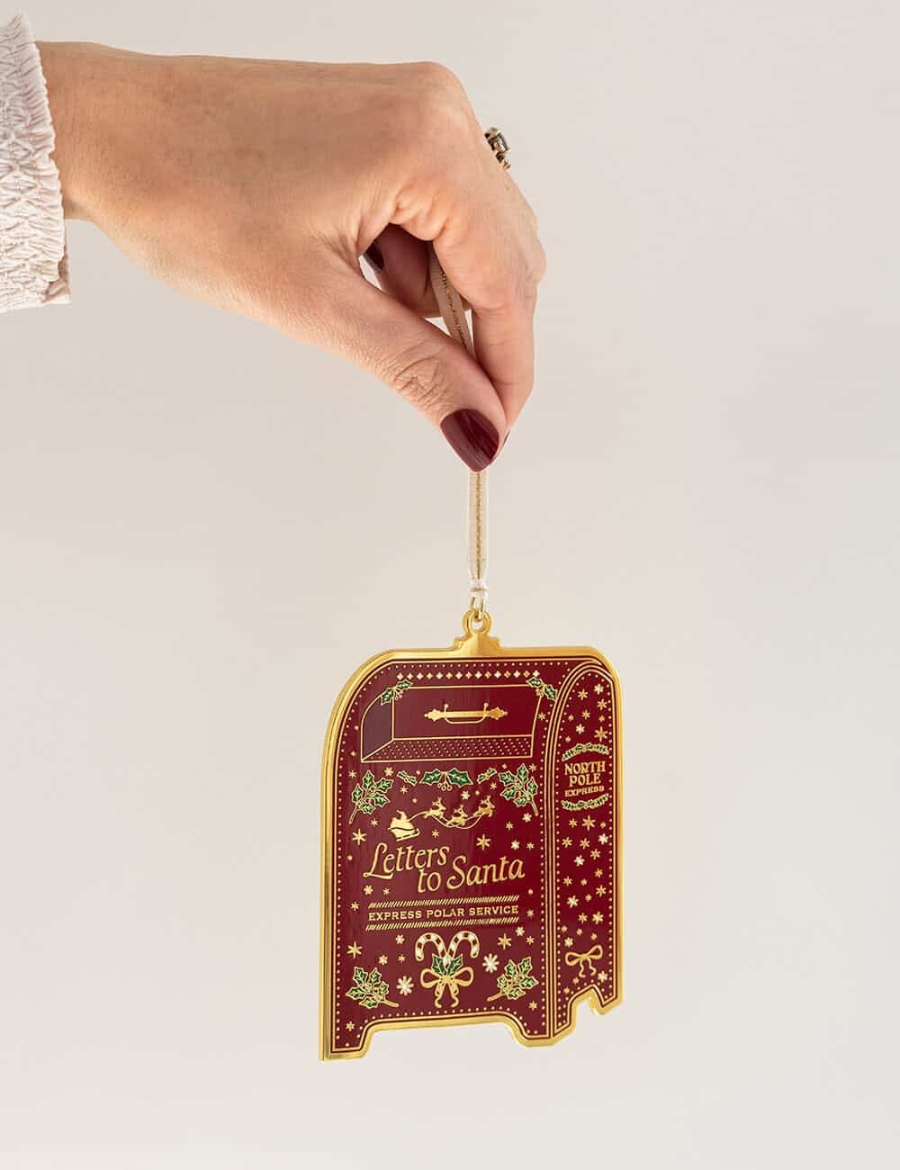 Fine enamel Santa’s Mailbox ornament, complete with fine gold line ribbon.