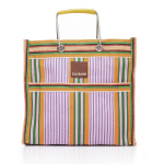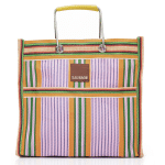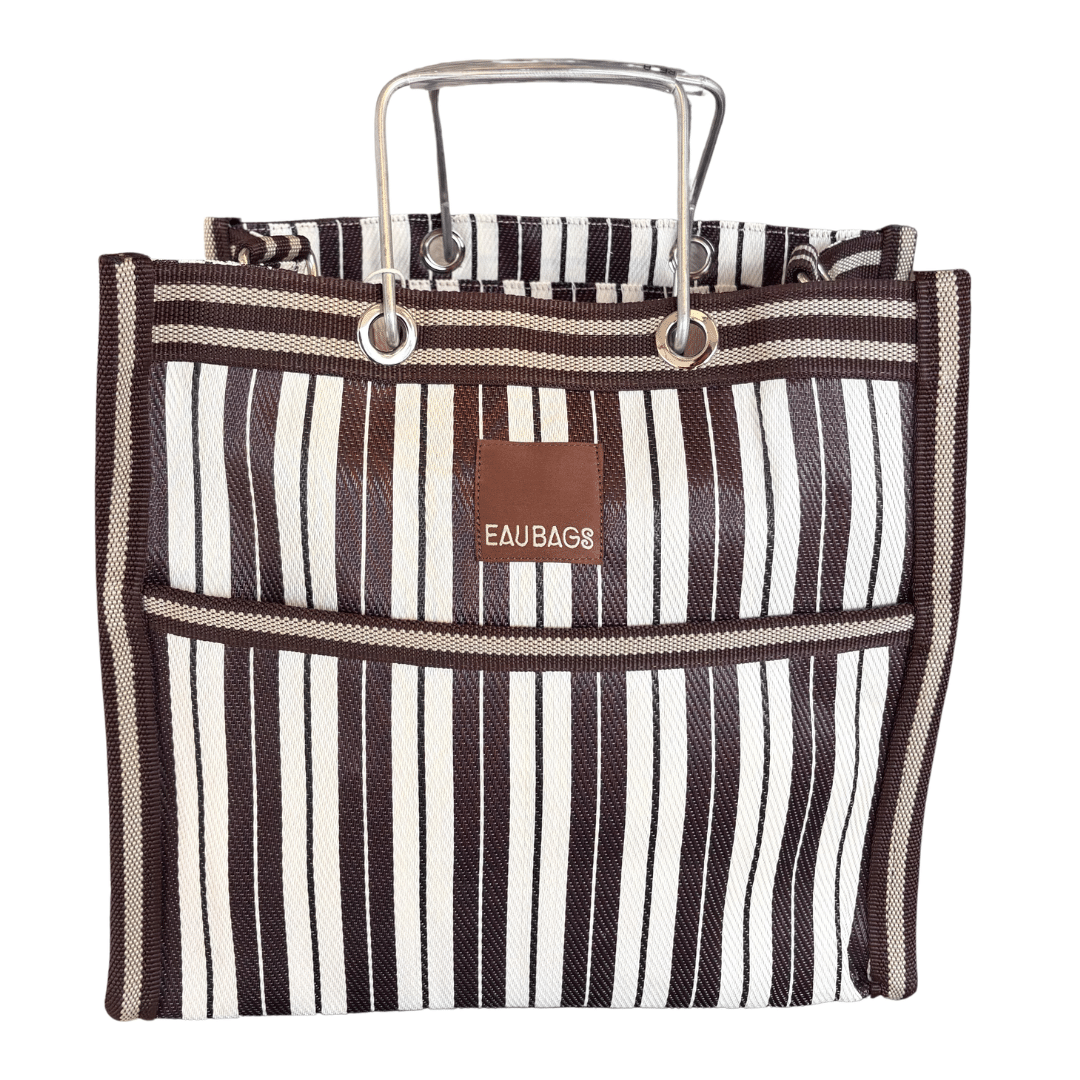 Open style with internal and external pockets Features unique industrial metal handles.