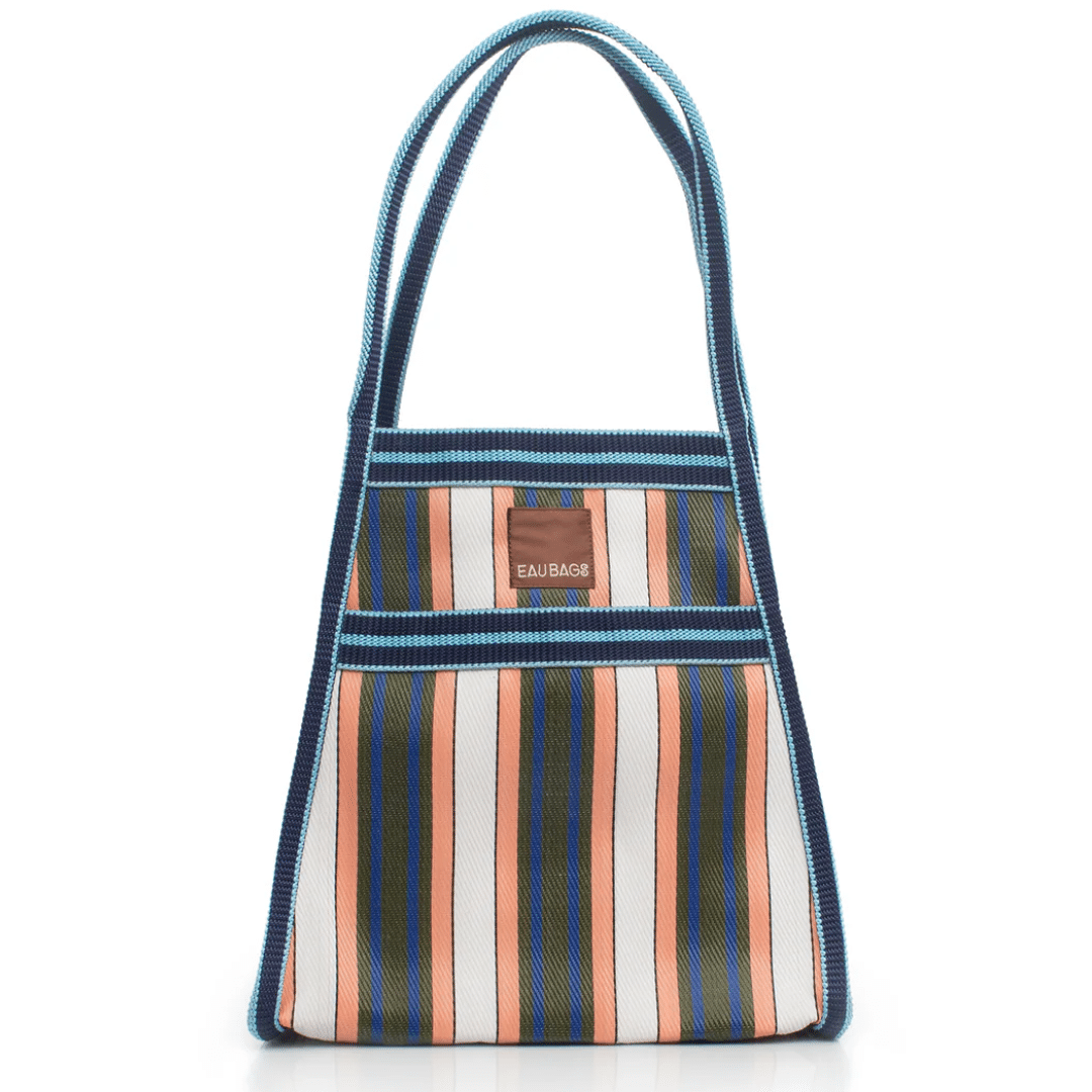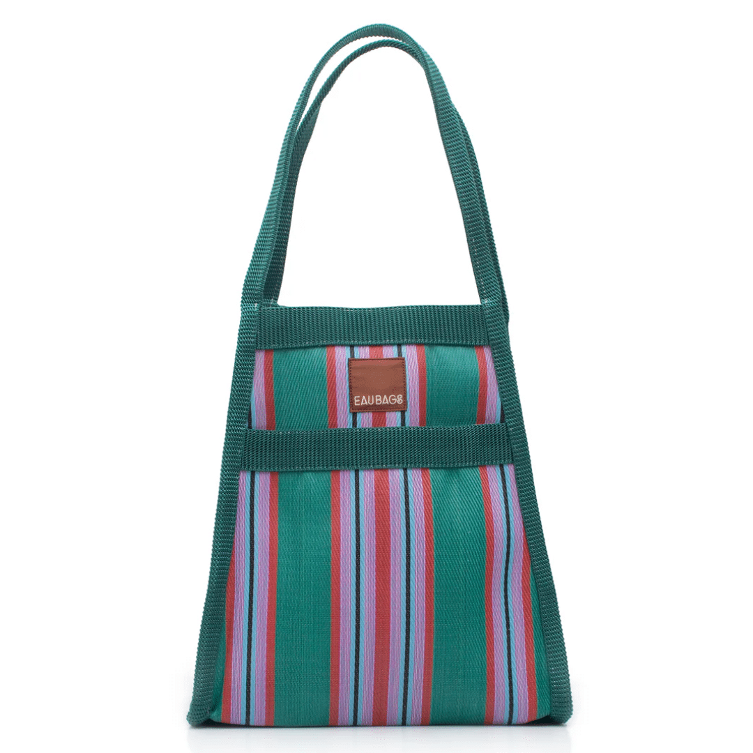 Each EAU BAG is handcrafted by skilled artisans in our dedicated studio in India. Olivia and Claudine visit their studio regularly to spend time with the team and oversee the making of each collection. Our signature stripes are made from 100% recycled nylon – an upcycled material created from waste like discarded fishing nets, old carpets and factory off-cuts. These materials are collected, cleaned and melted down before being spun and hand-dyed into new nylon yarn. The yarn is then woven into our durable striped fabric before being cut, stitched and assembled by hand into your most used bag. Because these materials have lived a life before becoming an EAU BAG, you may notice subtle variations in colour, texture or stitching. These are not defects, but part of the bag’s story – proof it was made by real hands, from materials that once existed elsewhere.