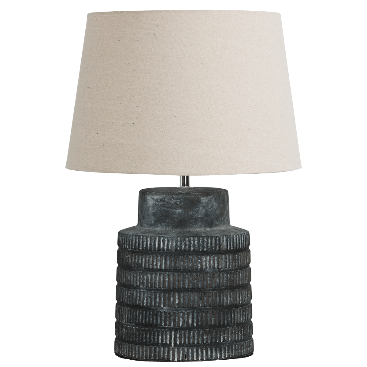 The Haddon Lamp has a beautifully crafted pattern base in a grey terracotta and is complemented by a natural cotton shade. This lamp will bring artisan texture to any space.
