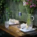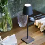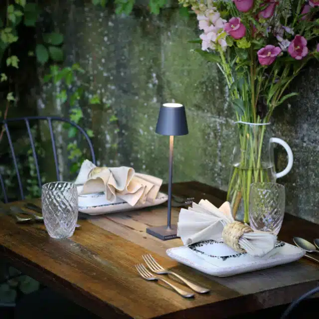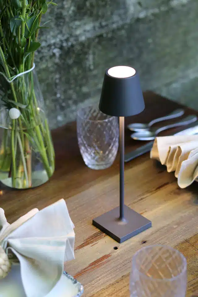 Cordless, rechargeable and portable lamp for indoor or outdoor use. Great indoors if you don’t have power where you need it or just simply don’t want messy cords cluttering up your space.
