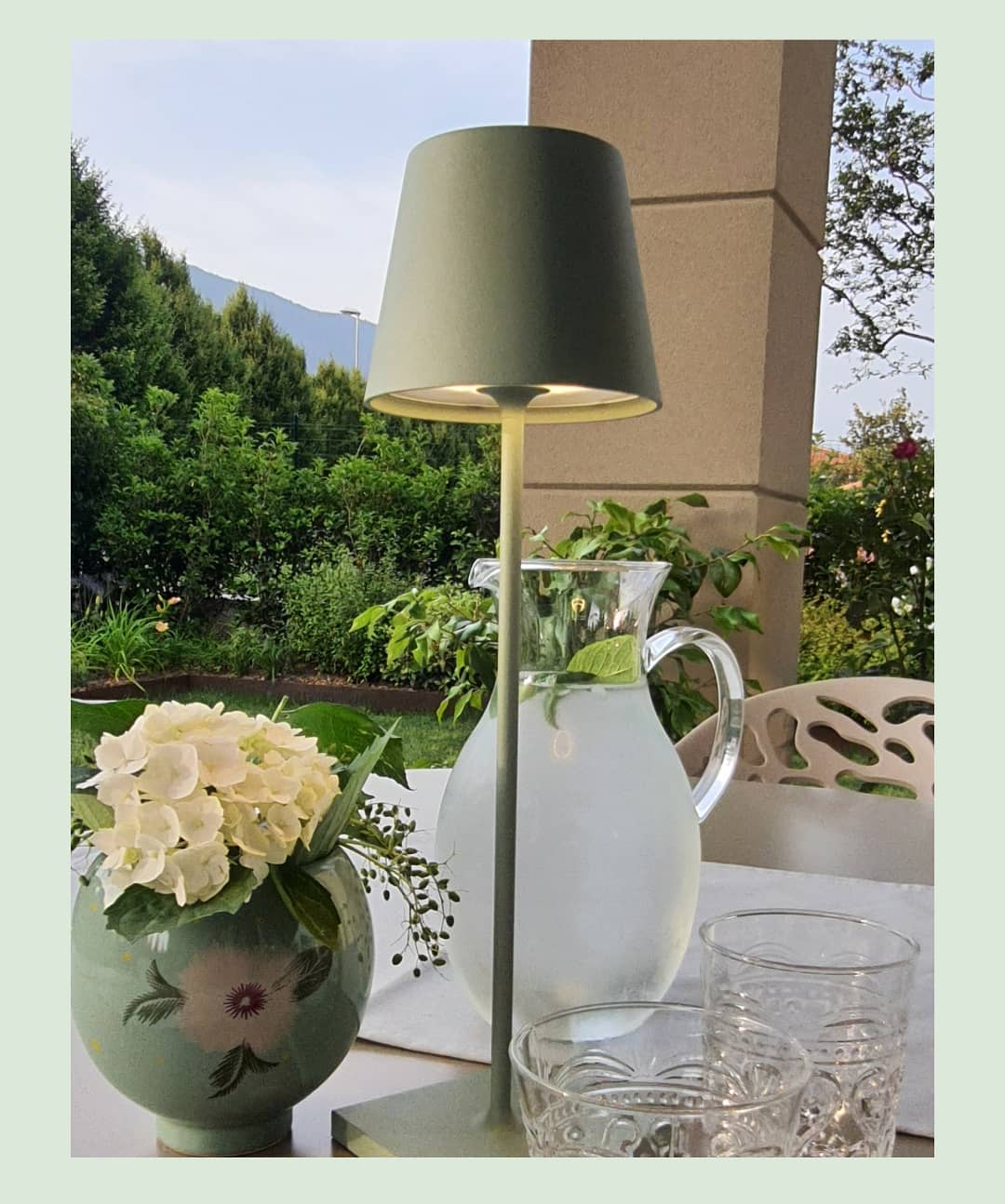 Cordless, rechargeable and dimmable portable lamp for indoor or outdoor use (IP54 protection).