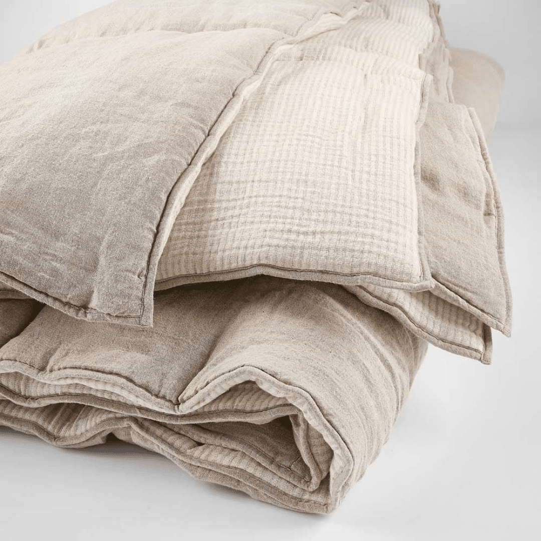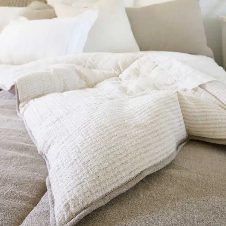 Our new pinstripe design, the Marina reversible quilted bed cover epitomises refined simplicity. Slowly hand quilted and featuring a natural fine stripe on one side and a block natural colour way on the other. Timeless and classic, the subtle stripe suits a variety of interiors and colour palettes.